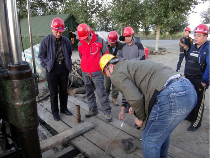 在高力板凹陷“高zk1井”施工现场,调研组对井口涌水中发现的可燃气体溢出情况进行了检查,并对采集的样品进行了点火实验,认为该气体具有较高的勘探价值。在详细观察岩心后,调研组指出要对岩心中特殊岩性及构造加强编录描述,根据岩心中的断裂发育情况,提出了可燃气体可能来源于下部的早中侏罗煤系地层中。