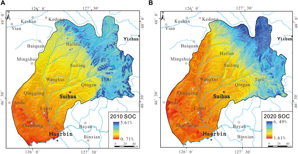 利用Landsat预测呼兰河流域不同年份SOC空间分布 ( (A)2020 年; (B)2010 年)。