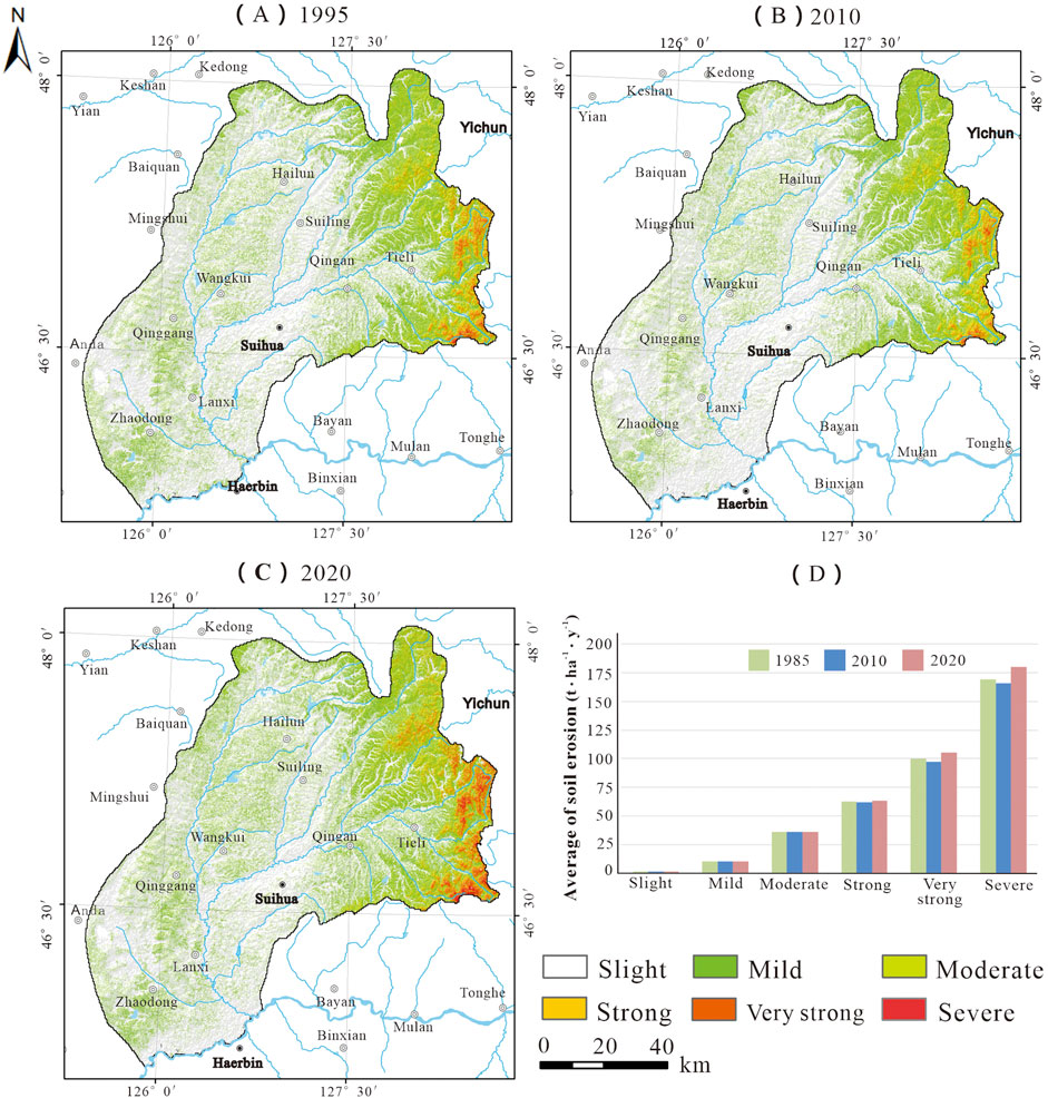 1995—2020年呼兰河流域不同土壤侵蚀程度分布及土壤侵蚀统计((A) 1995年侵蚀程度分布;(B) 2010年侵蚀程度分布;(C) 2020年侵蚀程度分布;(D)每个类别的土壤侵蚀平均值)。